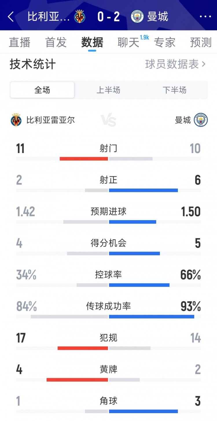 2025-10-22 08:17:23曼城2-0比利亚雷亚尔全场数据:射门10-11,射正6-2